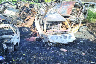 हाईटेंशन लाइन से निकली चिंगारी से कबाड़ वाहनों में लगी आग हाथरस।…
